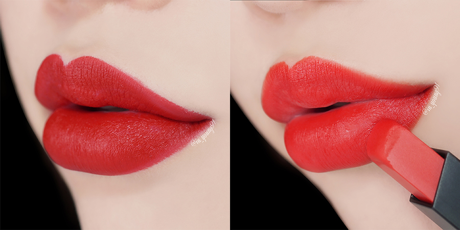 왼쪽이 21호 루쥬 패러독스는 깔끔하게 떨어지는 붉은 피처럼 강렬한 레드립입니다. 너무 답하지 않고 살짝 다크함이 더해진 고혹적이고 섹시한 레드컬러입니다.